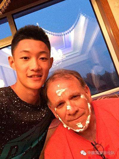 中国男子跳远队小将王嘉男给亨廷顿庆生。