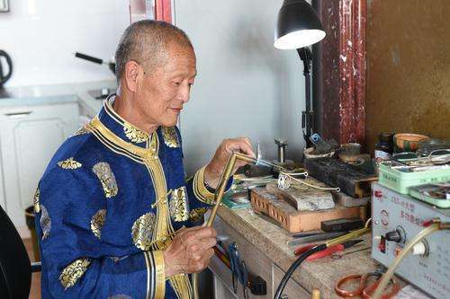 “在我学蒙古银饰制作的时候,跟本没跟师傅学过,全凭自己钻研,为了偷师学艺,我经常跑到包头市区一些南方人开的首饰店去偷艺。因为对这份事业的热爱,时间长了,我就和几个打金师傅混熟了,与他们在店里与之闲谈之时,自己便留心人家是怎样打金打银的,回到家后,我便自己琢磨,试着做一些简单的戒指和女式的耳环,慢慢的从手工打样到拔丝和焊接等一些做银饰的基本功就掌握了。”红星达尔罕老人笑着对记者说。