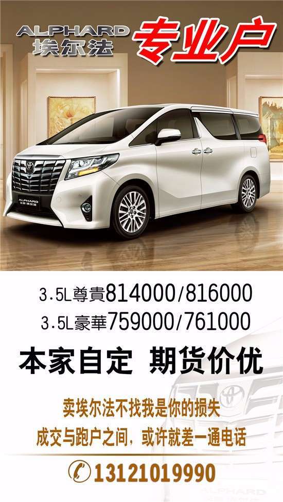 丰田埃尔法最新价格变动报表单位:万元 车型 颜色 现价 优惠幅度 现车情况 2017款丰田埃尔法蒙娜丽莎 电议 电议 优惠 现车充足 埃尔法 · 蒙娜丽莎|皇家贵宾舱 丝蕴/意象 私人定制款 商务车配置表 电子影音设备 ● 一键式超静音24寸高清液晶升降电视 ● 日本健伍影音系统 ● 220v电源接口USB.VGA多功能连接口 ● 贵宾舱奢华隐藏式冰酒柜 ● 车载触控屏中控系统(人机交换系统) ● 车内电器无线控制系统 ● 智能隐藏储物柜 ● 智能隐藏式极具现代化奢华酒柜 ● 一键式电动升降雾化隔屏 ● 德国原装进口内置集成调光器阅读灯 内饰商务配置 ● 豪华手动折叠隐藏航空铝镁合金定制小桌板 ● 全车奢华珍稀龙血檀木装饰 ●定制迈巴赫式六宫格光纤顶灯 ● 精影复刻樱花元素珍稀龙血檀木定制地板 ● 后排奢华原装进口一键式记忆电动折叠航空首长席座椅(加热,通风,气动按摩) ● 四季实用透明环保地膜 ● 整车Modellista原装进口立体大包围 制表:凤凰汽车 \u00A0