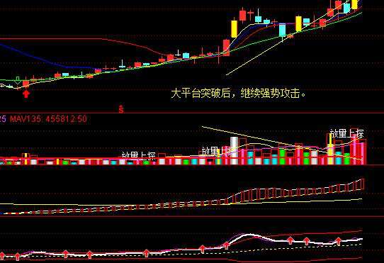 1,大平台突破后,继续强势攻击。盘中虽有震荡,收盘还是继续突破上极限。