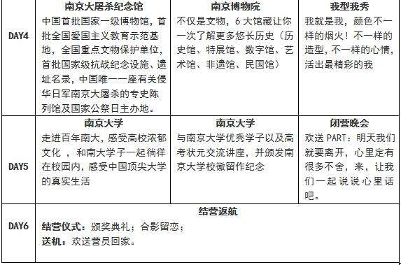 4、营员须自带的生活用品,书包、牙刷、牙膏、毛巾、洗发液、沐浴液;背包一个、手机、换洗内衣裤、外衣裤,袜子、运动鞋。(夏令营有统一服装,自带衣物为替换);