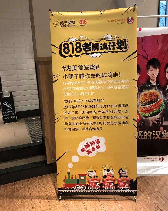 除了KFC,必胜客也不甘示弱。成都必胜客上线专属福利,来成都必胜客吃鳗鱼饭不但能免费获得818苏宁易购套券卡和苏格拉宁小狮子玩偶,吸引了大批粉丝。