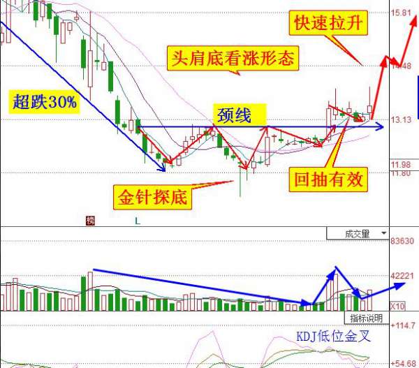 股价从高位超跌30%都没有像样的反弹,而在低位形成“头肩底”看涨形态,其中最低位的“长下影T字线”是“金针探底”K线底部企稳形态,而且持续缩量证明大量散户割肉离场。现在股价已突破“头肩底”颈线,并且回抽没有再次跌回颈线以下,证明回抽有效。KDJ金叉、均线多头排列,证明上涨趋势形成。