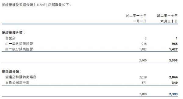 公告显示,截止2017年6月30日,“LILANZ”品牌的店铺数量共2,393家,期内净减少7家,主要是因应实际经营状况调整店铺网络提升效益,以及百货商场店中店数目减少所致。
