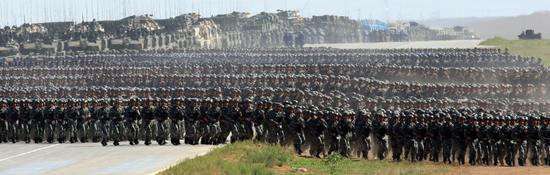 在7月30日,中国解放军举行首次沙场阅兵,受阅官兵列阵沙场,以战斗姿态接受检阅。这次阅兵共有1.2万余名将士、129架战机和571台车辆装备参加,其中40%是首次参加阅兵。