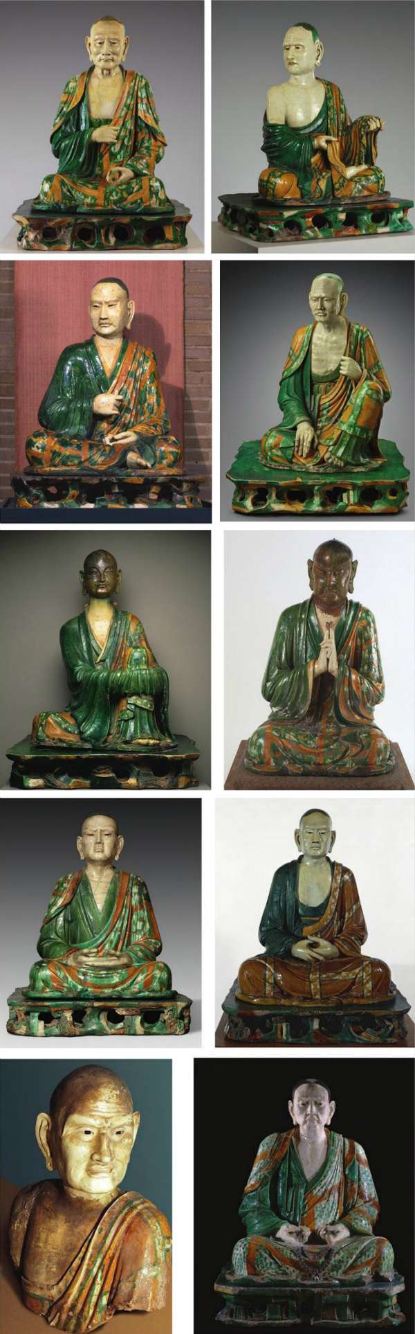 现收藏于各大博物馆的10尊易县三彩罗汉像。从左到右、从上到下分别收藏于美国大都会艺术博物馆(老)、大都会艺术博物馆(年轻)、美国宾夕法尼亚大学考古学及人类学博物馆、美国波士顿美术馆、加拿大皇家安大略博物馆、日本现代美术馆、美国纳尔逊艾金斯艺术馆、大英博物馆、俄罗斯冬宫、法国吉美博物馆。