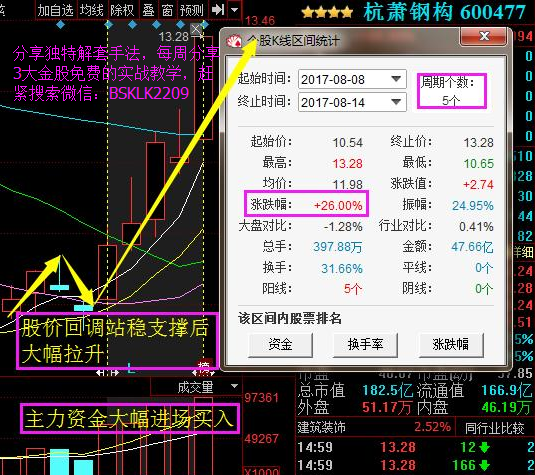 杭萧钢构(600477),该股是笔者用波段趋势法分享的其中一只股票,截止涨幅已经26%了。相信这样的收益对不少的人来说,都是非常不错的了。而这种股票选起来也并不难,只要会看趋势,会跟庄操作。没把握住这波涨幅的朋友们也不要气馁,后期我还会继续给大家分享讲解波段趋势法的选股思路,只要你用心关注笔者,那肯定不会错过!