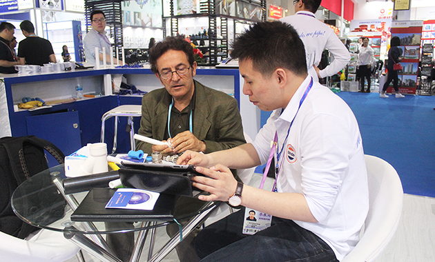 15日早上,广交会开幕式之后,琶洲国际会展中心人潮涌动,金德张开宽阔的怀抱,迎接来自世界各地的客商。一天时间内,金德展馆里人头攒动,来自俄罗斯、印度、巴基斯坦、哈萨克斯坦、埃及、马来西亚、菲律宾、蒙古等多国采购商莅临金德展馆,海外将士面带微笑,热情接待,耐心介绍,诚意洽谈,外商被金德人的精神面貌所感染,纷纷为金德人的热情和专注竖大拇指。
