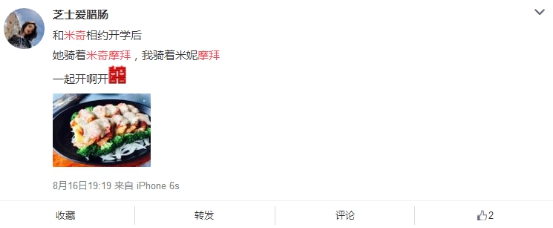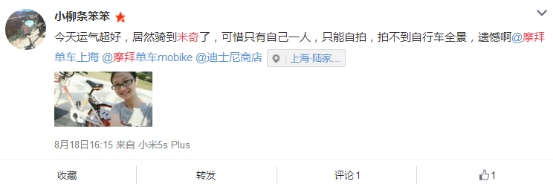 微博用户@小柳条笨笨表示:“今天运气超好,居然骑到米奇了,可惜只有自己一人,只能自拍,拍不到自行车全景,遗憾啊!”,用户@芝士爱腊肠说道:“和米奇相约开学后,她骑着米奇摩拜,我骑着米妮摩拜,一起开啊开”。