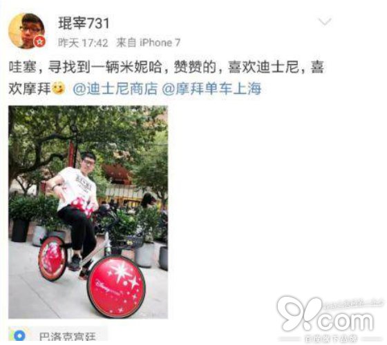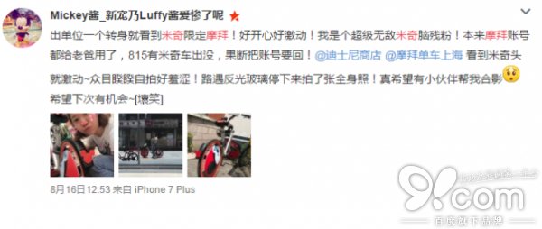 还有微博用户留言称:出单位一个转身就看到米奇限定摩拜!好开心好激动!我是个超级无敌米奇脑残粉!本来摩拜账号都给老爸用了,815有米奇车出没,果断把账号要回! 看到米奇头就激动~众目睽睽自拍好羞涩!路遇反光玻璃停下来拍了张全身照!真希望有小伙伴帮我合影。