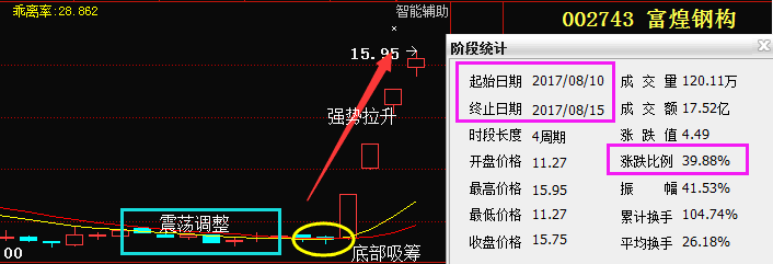 同样的富煌钢构跟卧龙前面说的安阳钢铁一样的,都是用“三步抓牛”选出来的,富煌钢构前面震荡吸筹之后,在9号选出后,强势拉升,截止15号涨幅超过39%,当时有很多朋友抓住了这一波巨大的收益了。试想一下,如果你在9号之前是卧龙的粉丝,并且学会了这种选股法,介入了富煌钢构,算下也能抓到这39个点的涨幅呢?错牛股并不是随随便便选不出来,而是需要技术来选股,如果你之前没有关注卧龙看盘,没有学习这种选股方法,是不是就错过了这些?