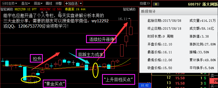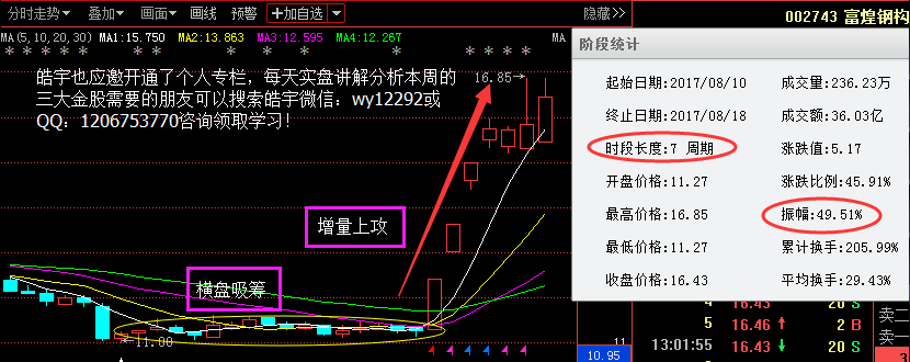 8月10日用“一分钟选股法”选出来之后并且在本人专栏讲解,该股拉升之后一直处于横盘整理的情况,股价跌至低位11.27元,站稳支撑线,股价开始震荡吸筹,主力大肆买仓,之后股价开始一波反弹,涨至高位16.85元,短短7个周期的时间,区间的涨幅也是超过了49个点的。当然是皓宇专栏的粉丝只要是及时看了专栏文章的肯都是抓到了这波利润的。
