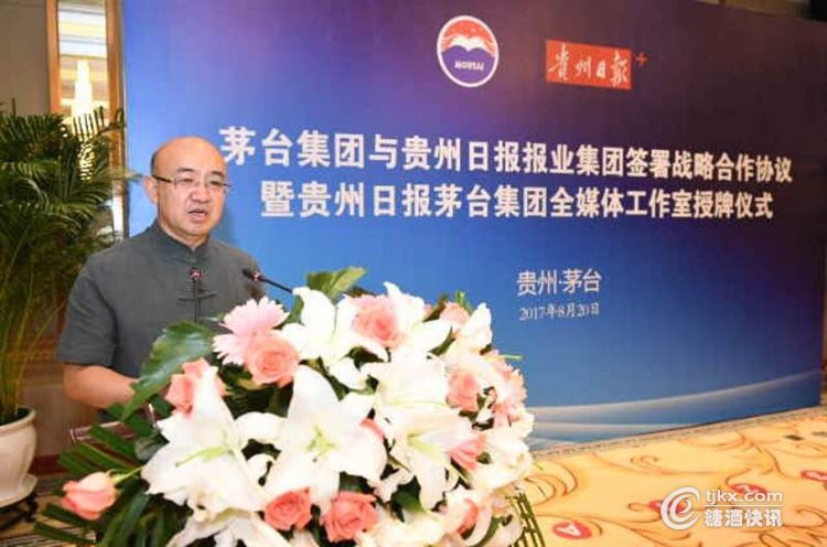 在全省上下进一步贯彻落实以习近平总书记为核心的党中央治国理政新理念、新思想、新战略,贯彻落实省第十二次党代会精神,全省干部群众按照省委、省政府的号召,撸起袖子实干兴省,喜迎党的十九大胜利召开之际,我们相聚在美酒飘香的赤水河畔,共同签署茅台集团与贵州日报战略合作协议,共同为贵州日报茅台集团全媒体工作室的组建授牌,以实干、创新的方式响应省委、省政府号召,推进优强企业与主流媒体的开放合作、优势互补、创新发展,推进文化与经济的深度融合,进一步提升中国民族品牌国酒茅台的影响力、文化力、发展力、创新力,进一步提升主流媒体贵州日报的传播力、引导力、影响力、公信力。