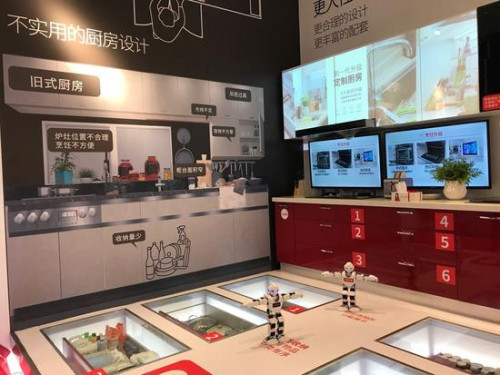 ??尚品宅配的VR HOME独占一隅,专门设立了VR展台与观众互动。在展位门口,尚品宅配还引来了机器人站台,将不实用的厨房设计与更人性的定制厨房进行对比,通过柜体分解展示了有序的收纳空间,将怎样是更合理的设计、更丰富的配套真实的呈现出来。
