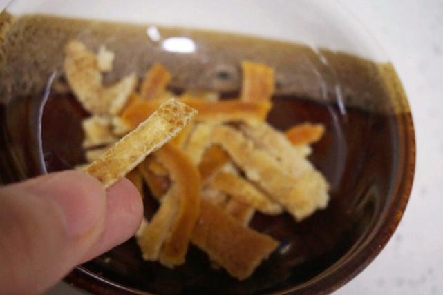 2、陈皮用清水泡软,洗净,然后用小刀轻轻刮去内层的白膜,切成丝。