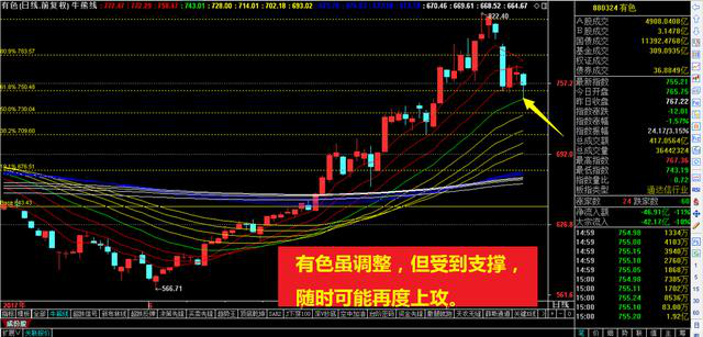 有色板块在受到750点的支撑后连续两天企稳,正常应该就会去攻击前期的高点了。今天却出现了调整,但是最终受到了平地高楼61.8%线以及牛熊线绿色线的支撑,站稳在了750点之上。只要接下来收阳向上,则上攻还有希望。另外,有色现在是单边上涨——单边下跌,即便是顶部,理论上还会有一次反弹的机会。到了反弹不创新高的时候,那是最后的出局机会,现在还是相对有希望的。