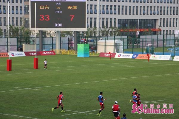 16:50,男子决赛山东对阵天津。山东男子队员在开场就展现了强大的实力,再加上东道主天津队刚开场一位队员就因为过高扑搂,被黄牌罚下两分钟,山东队抓住机会通过持球接触抗传,传球跑动突破接连达阵得分。而东道主天津队也是不甘示弱,顽强拼搏获得一次达阵,半场比赛结束,山东男子以26比7领先东道主天津。进入下半场,比赛更加激烈,不断出现对抗、扑搂、ruck等争夺球权的动作和集团,时间过半山东队八号球员抓住机会,从自己后场飞奔90米长距离达阵成功,并成功追加射门,最终比分33:7,山东男队夺得金牌。巧合的是,山东男女队得分都是33分。