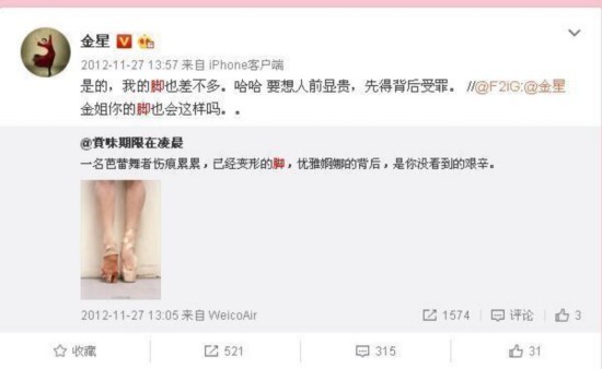 有網友問金星,金姐的腳是不是也會這樣?金星回復說她自己的腳和圖片上的腳也差不多,想要人前顯貴就要現在背后受罪。