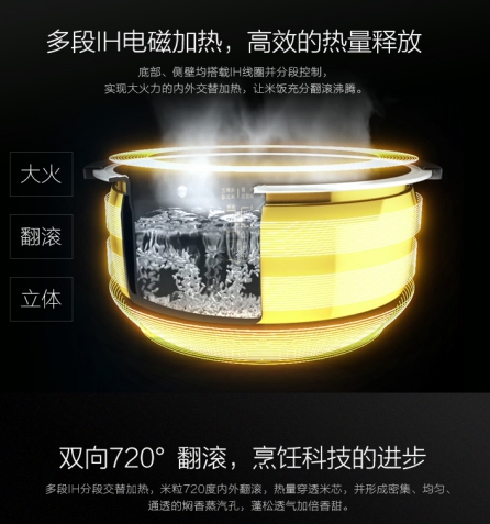 美的真空变压IH电饭煲是怎么让米饭更可口的呢?首先,美的真空变压IH电饭煲融入了获得中国实用新型专利的多段IH技术,底部、侧边均搭载了IH线圈为内胆提供强劲火力,并将火力分段控制,煮饭过程中大小火力交替,让内胆迅速升温,米粒在煲仓中双向 720°翻滚沸腾,充分均匀受热,随着热量穿透米芯,米粒间也形成了密集、均匀、通透的焖香蒸汽孔,由此煮出来的米饭口感较为蓬松有嚼劲。