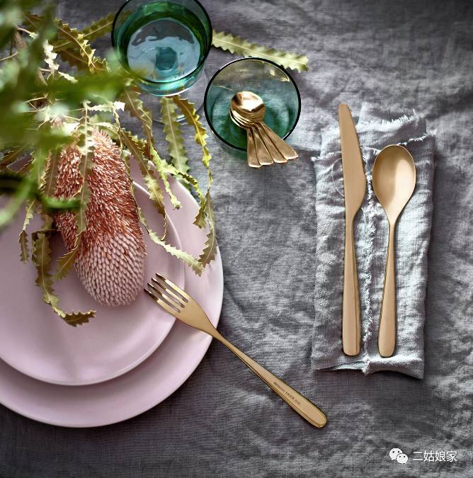 黄铜色的刀叉布置餐桌