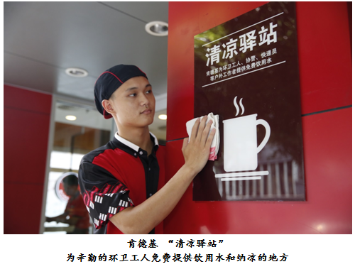 肯德基将福州市鼓楼区津泰餐厅打造为文明主题餐厅,设置文明标语,倡导垃圾不落地自助收餐盘、取餐自觉排队,光盘行动不浪费等文明行为。同时,肯德基还在福州市区所有餐厅设置“清凉驿站”,为辛勤的环卫工人免费提供饮用水和纳凉的地方。