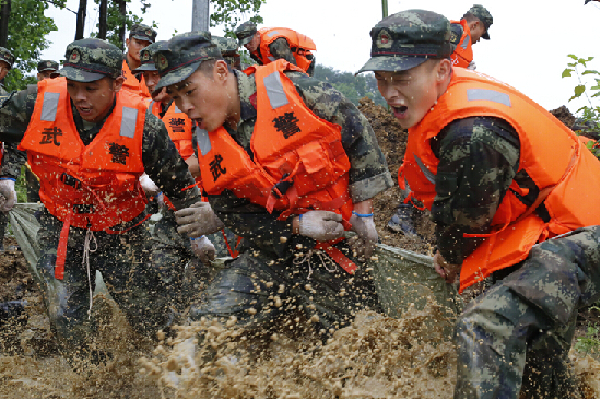 身处抗洪一线的解放军战士