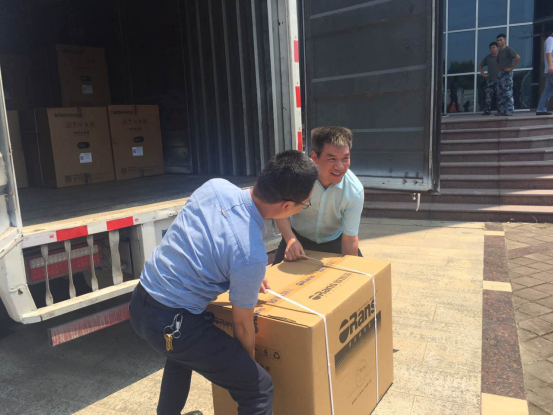 欧路莎卫浴董事长林华友(右)参与搬运智能马桶