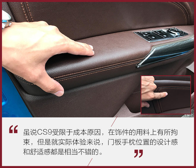 由于职业关系的原因,打开车门的第一时间肯定是到处乱摸,门饰板由多种材料组成,别看都是棕色的,但是只有枕手部分是柔软的,别的地方都是硬塑料,撇开材料不说,柔软的垫手部分舒适度还是可以的。