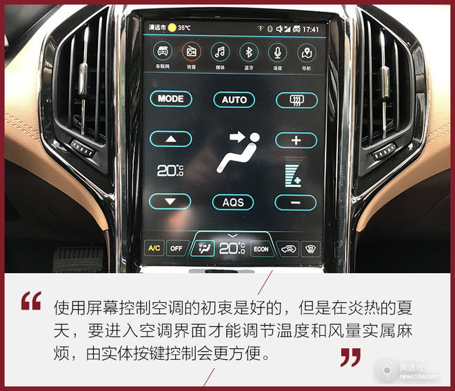 空调界面是比较清晰明了,但是如果是在行车中,要调节起空调来会分神,触摸屏控制不像实体按键一样可以盲操作,另外要说明的一点是,语音控制也是能控制空调温度的,但是每次只能升降0.5度,如果从26度调到20度要对着语音说12次!