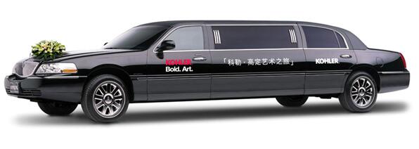 高定礼遇一:优雅出发。科勒特派外观贴有“科勒高定艺术之旅”的加长林肯作为观展专车,备有来自美国科勒的红酒,让你从出发就开始“高定”享受。