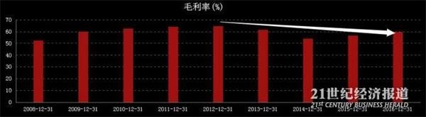 据介绍,贝因美一向走高毛利、高费用路线,数据显示,公司毛利率常年均在60%以上,但随着公司抢占三四线城市份额逐渐打起“促销牌”,毛利率一度从2013年的61.85%下跌至2016年的59.66%。
