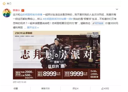 随后,志邦将传播阵地转移至微博,开启话题#志邦厨房派对你站哪一派#,鼓励全社会人群一起参与讨论。贴近目标人群生活的话题,大咖带队参与讨论,加上插入促销福利,多重刺激引发了无数网友与微博大V自发参与话题讨论,话题声量瞬间引爆。8月14日,话题总阅读量突破千万,附带的秒拍链接,更是让宣传片播放量突破500万。当晚,蔡康永微博发文,博文冲上微博热门榜单的同时,也带动话题再次发力,一举冲破2000万阅读量,掀起全民热议浪潮。