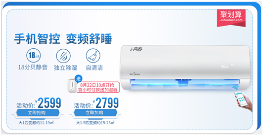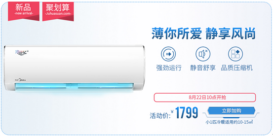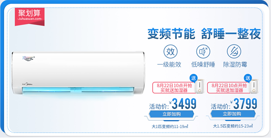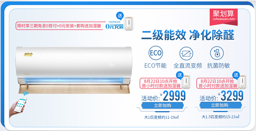 \u00A0\u00A0\u00A0 8月22日-24日,天猫美的空调旗舰店发起“家电尚新节”主题活动,聚集各路豪侠与你一起迎接初秋!活动期间3期免息0首付,劲省400元起;8月22日10点开抢,首小时付款还将赠送加湿器1台。优惠力度众多,惊喜不断,快来加入吧!