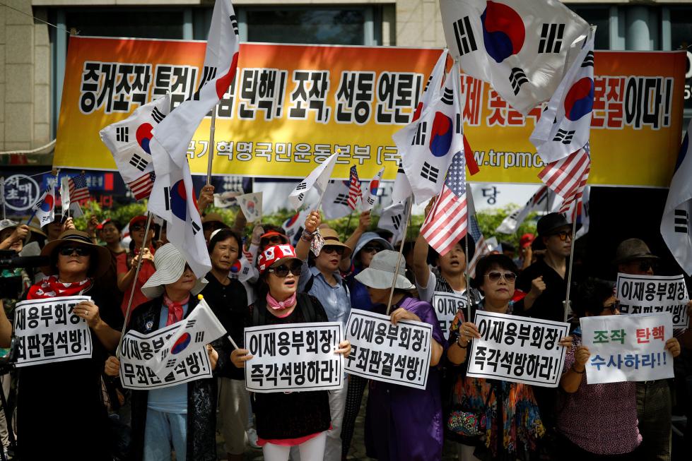 朴槿惠支持者举星条旗要求释放李在? 当地时间2017年8月25日,韩国首尔,韩国前总统朴槿惠的支持者举行游行,要求释放三星电子副会长李在?。 【详细】 强图打榜 2017-08-25 14:51:44