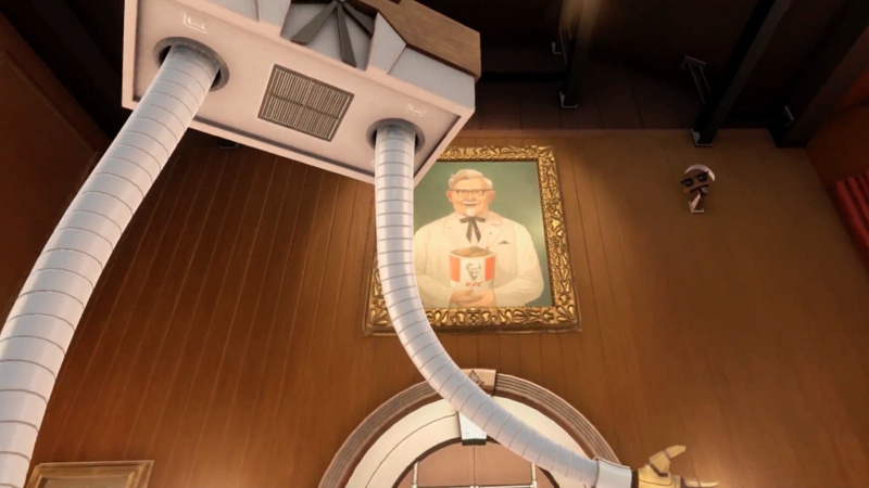培训的员工会被VR头显带入一个虚拟幽闭的房间,里面有一框鸡肉、炸鸡设备和邪恶像容嬷嬷的桑德斯上校,不断催促你炸鸡。只有完成桑德斯上校的炸鸡训练,才能逃跑,不然就会被永远困在房间里。