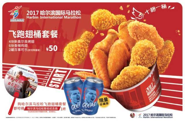 哈尔滨马拉松飞跑翅桶套餐仅限肯德基花圃餐厅、肯德基假日餐厅、肯德基中央大街餐厅、肯德基友谊餐厅参加,9:30-23:00供应。其他肯德基餐厅不参加此活动。具体情况以餐厅公示为准。