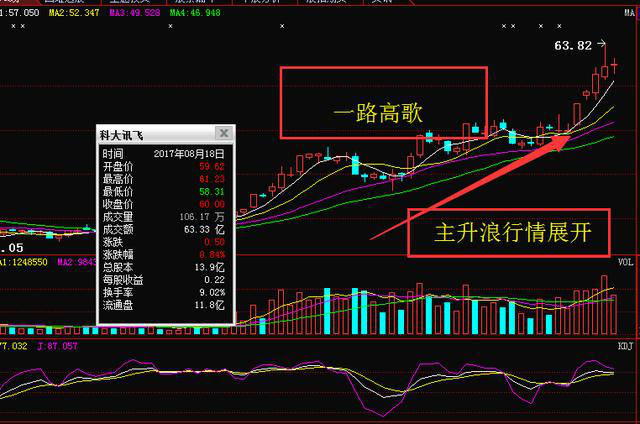我们从上图中可以看出,科大讯飞早在6月20日之前都没有一个好的表现,前期成交量低迷,均线上不能看出主力发力的迹象,从30日线上来看,前途渺茫,所以对于当时的走势,我解股认为很多人都不会看好的,但到了6月20日之后,市场发生了改变,我们从当时的成交量上看,主力已经完成了前面的一波低吸动作,随后展开了拉升,进入主升浪行情,这个阶段往往更多的投资者处于一个观望的阶段,这是很多人的一种操作习惯,即使我们当时看到MACD和KDJ金叉的时候,也还是不敢去进场的,这就是传统的思路决定了自己的口袋财富大部分都是负值的,现在涨幅已经很高,如果我们把6月20日后的那一波定义为第一波行情的时候,现在的行情就是一个鱼尾行情了,也是一个疯狂的行情,大部分人都跟不上,叹息错过了之前的机会,但这个阶段买进去往往面临的风险很大。