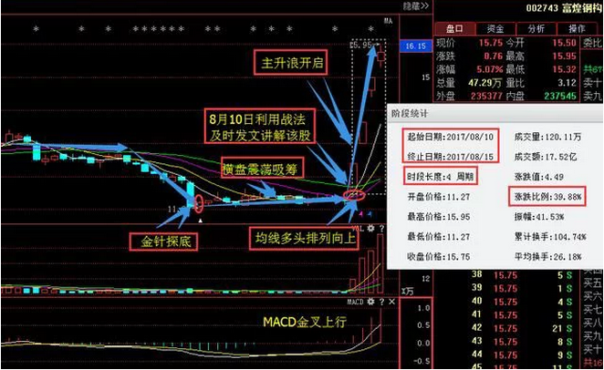 其实说到该股是本人也同样是在8月10日那天去利用战法发文讲解,大家可以看到该股在前期一路下跌,跌至底部形成了金针探底信号,随后开始企稳,在横盘的过程之中开始震荡吸筹,在8月10日该股的MACD金叉开始上行,均线多头排列向上,当时我就发文讲解了此股,大家也可以看到该股自本人用三步擒牛法讲解过后,短短4个交易日,涨幅也是达到了39.88%!这样的战法大家看过之后,牛不牛呢?我相信是非常好的一套战法,想学习的本人也可以去专栏中学习查看。