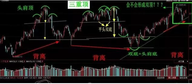 过去一段时间内,指数在3300点位分别走出了“头肩顶”和“三重顶”技术形态,这两种技术形态均属于“四大天顶”之一,其余两种分别为“双顶”和“圆弧顶”。可以发现,图像左侧的“头肩顶”走势很符合标准,通过等距可以清楚的勾画出指数下探的边界。最终在理论回落点位以及MACD底背离的共振下,企稳回升。图像中间的“三重顶”走势略微有点偏差,主要是在出现“三重底”的节骨眼上,指数出现了“平头双底”支撑,促使指数再度拉起一个顶,出现了“四重顶”的情况,故此跌幅再下一层也是可以理解的。最终指数勾画出“双底+头肩底”技术形态以及MACD底背离的共振下,企稳回升。以上3300点位附近的分析,均在日常的收评中做了提示,这里就不再做过多的赘述了。当前同志们想要知道是,此时指数在3300点位是否会形成“双顶”技术形态?细心的同志可以发现,MACD此时出现了底背离的情况。添加俞御薇衅呺:LJLJ618或QQ:843638770查阅学习