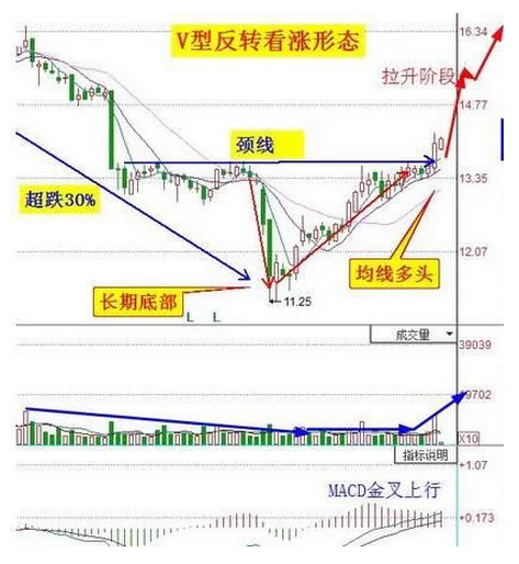 从上图中,我们可以看到该股的股价是从高位超跌30%都是没有什么像样的反弹,而在长期的底部,形成了一个“V型\