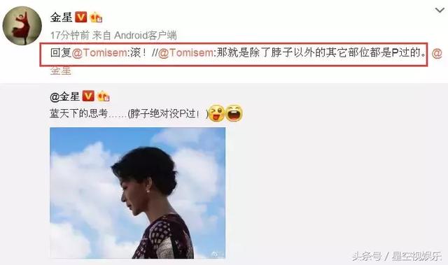金星都如此说明了,却还有一个脑回路比较溜的网友评论称:“那就是除了脖子以外的其它部位都是P过的。”作为娱乐圈的”毒舌“,金星可不怕遇到这样的网友,她直接干脆利落的回复了一个字:“滚!”