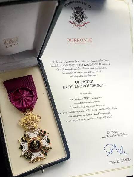 上市一周后,也即2017年5月3日,比利时联邦议会授予周宗文董事长“利奥波德军官级勋章”,以表彰其为促进中比两国经济、文化交流所作出的卓越贡献,这是迄今为止中国民间人士和商业领袖所获得的比利时王室授予的最高荣誉。