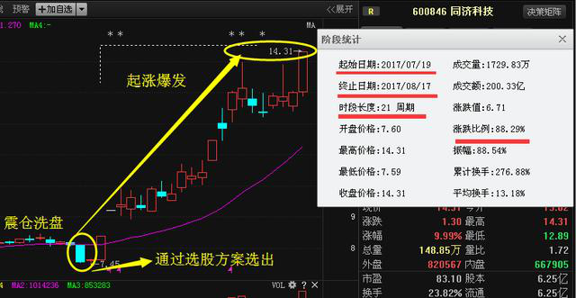 同济科技是志文在7月18在朋友圈中进行了讲解,我们可以看到该股之前一路横盘震荡,在讲解当天股价出现回踩,走出稳信号,而且主力资金持续流入量能放大,截止目前21个周期,涨幅也是达到了88.29%,如果,你在7月18号有幸看到本人的朋友圈,相信了本人,那么这88个点的盈利是不是轻轻松松能把握在手?