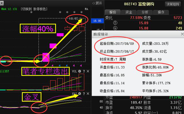 富煌钢构前期股价跟同济科技有点相似,股价没怎么上涨,一路横盘震荡,但是看到主力却在偷偷吸筹,在8月9号的时候,志文看到主力抢筹完毕,趋势出现金叉,当时就在朋友圈中发文讲解,之后连续出现了3个涨停,截止目前7个交易日涨幅超过40%。那么这里也是恭喜那些抓住了这2只股票的粉丝朋友,成功把握了其中的利润。
