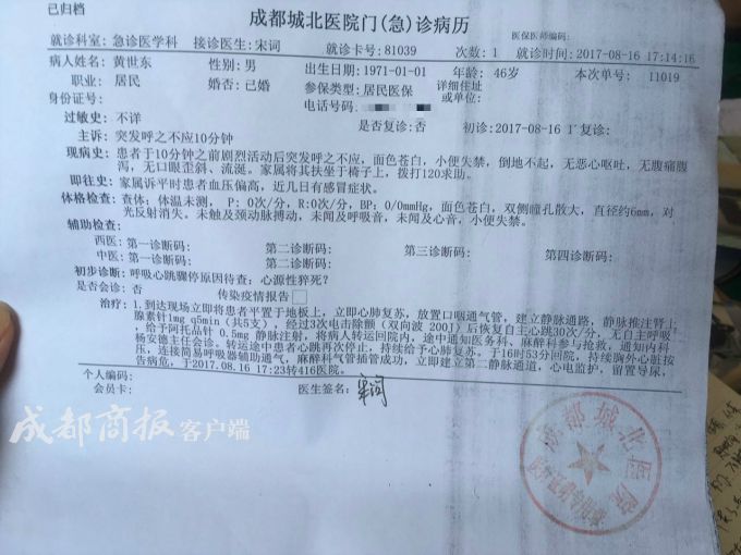 成医附二院·核工业四一六医院的出院证明书显示,10分钟后城北医院急诊科到达现场后发现患者呼吸、心跳停止,血压测不出,立即进行急救,虽然经过一系列的抢救,但是患者依然持续深昏迷,氧合差,循环不能维持,严重代谢性酸中毒,无尿,肝功能不全,凝血功能异常,家属决定放弃进一步治疗。“当时医生跟我们说,意识缺失4分钟基本上就没有救了,所以我们决定放弃治疗。”袁建华说,10点半左右,黄世东被宣告死亡。