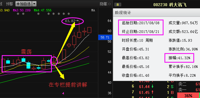 科大讯飞002230股价经过前期的一波上涨后,进入了横盘调整阶段,也是可以在此处讲解出来,讲解出来后截止目前累计涨幅\u00A041.32%,也就是说只要你学会了这套选股思路是不是也能轻轻松松收获这样的短线大牛股了?所以当时宇轩在专栏上重点的讲解了此股,果然不出所料启动了大涨,当时看了专栏讲解并且相信了宇轩的朋友应该都是拿下了这一波不菲的利润。错牛股并不是随随便便选不出来,而是需要技术来选股,如果你之前没有关注宇轩,没有学习这种选股方法,是不是就错过了这些?添加宇轩微信:dy600018或QQ:3123691873