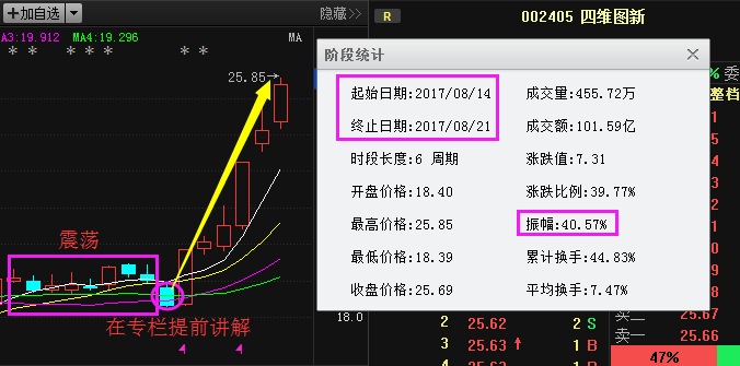 宇轩说过我们选股肯定要选那种低位股票,而不是等股票大涨时候追高买入,宇轩通过“三步抓牛”选出的四维图新这只股票,8.14号那天专栏通过三步抓牛选股法选出,前期一波行情短线调整后,震荡调整结束,底部金叉出现,开启拉涨,短短6个周期累积涨幅达40%,先恭喜我专栏的粉丝朋友抓到了这一波的涨幅,没有抓到的朋友继续努力,只要你持续查看专栏的文章你迟早也能学会我的三步抓牛选股法。这就是宇轩说的要把利润最大化,相信当时看宇轩专栏讲解的朋友已经把握住了。添加宇轩微信:dy600018或QQ:3123691873