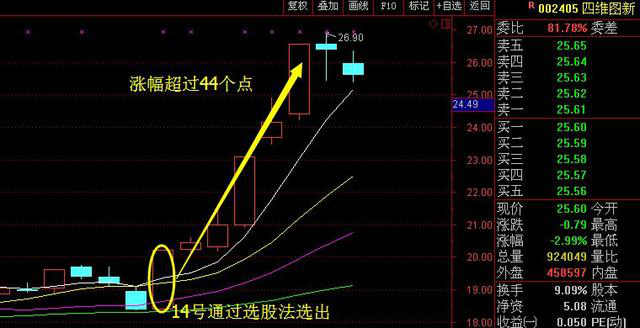 而这种上升回档走势的股票其实是有非常多的,就像本人在14号通过选股法选出的四维图新(002405)也是一只典型的上升回档走势的股票: