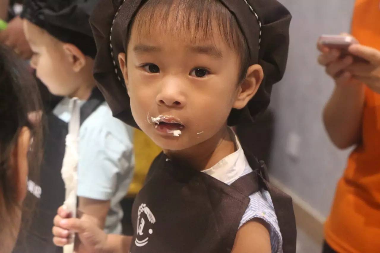 不过小朋友们似乎觉得一边做蛋糕,一边吃似乎更加有乐趣呢~哈哈,看看一个个都变成了小花猫了呢