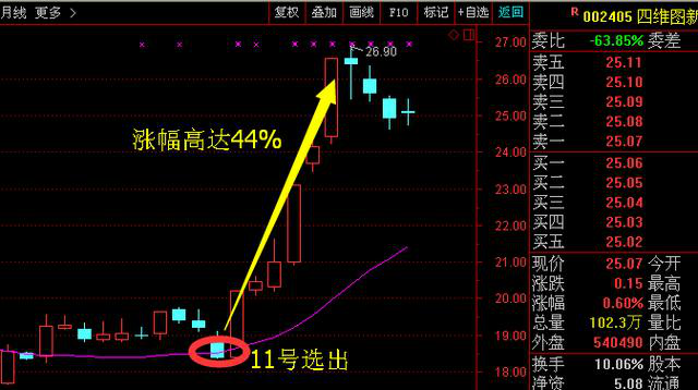 本月11号我在朋友圈通过回调低吸的选股思路给大家讲解的四维图新,自讲解之后,一路大涨,6个交易日时间涨幅高达44%。当时很多人看到朋友圈文章,抓住了机会,现在应该都是抓住不错的收益了。机会有很多,下周行情会产生更多涨停股,要提前准备。今天我同样是用回调低吸的选股思路选出有望从底部起涨的强势利好个股,走势图如下: